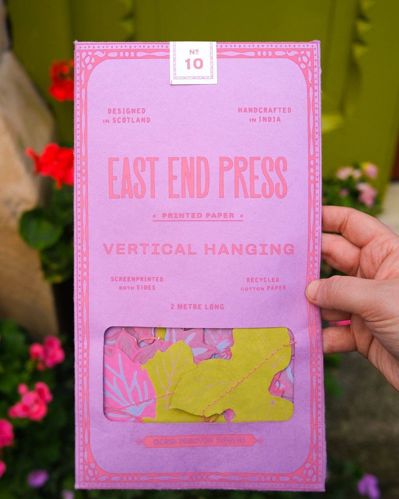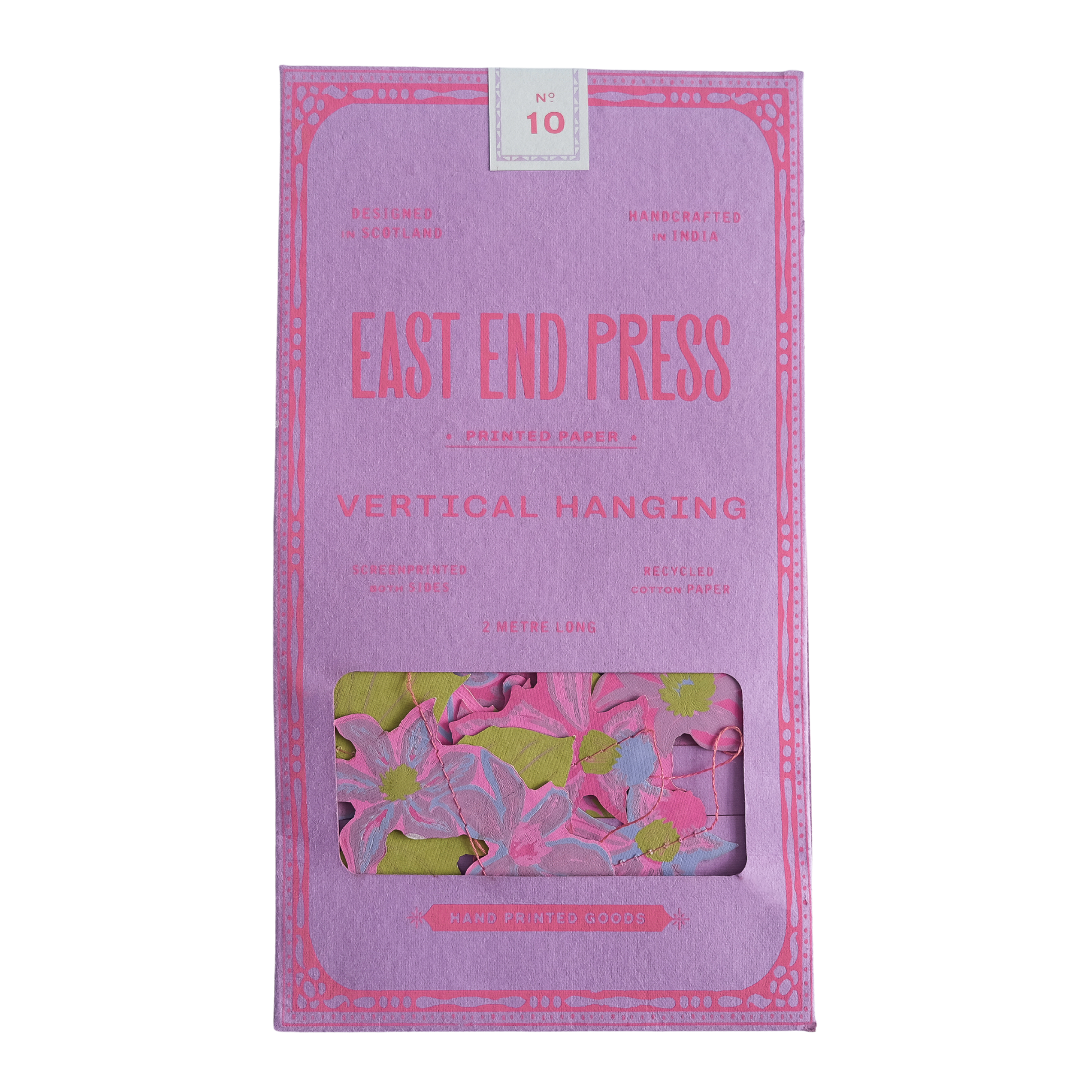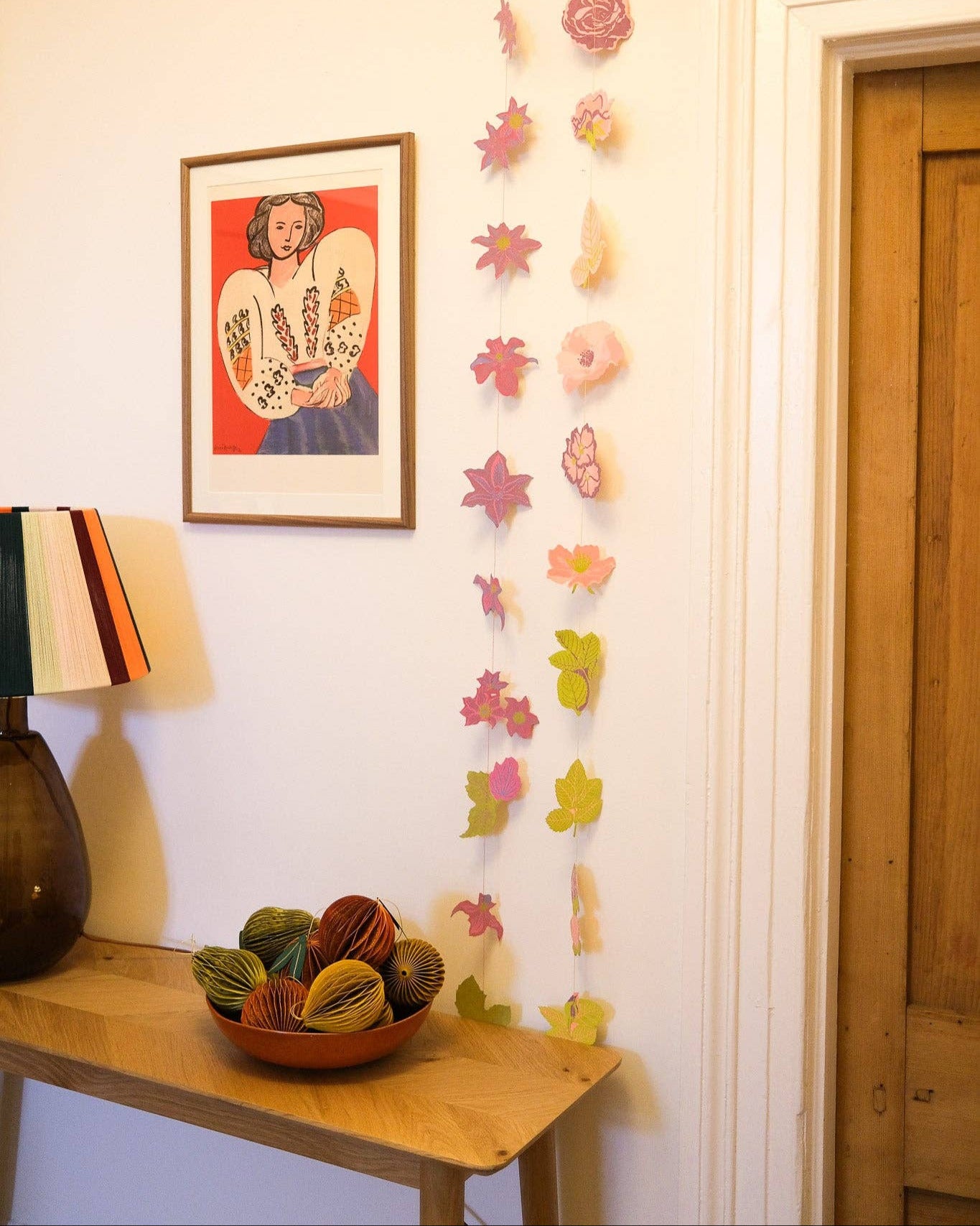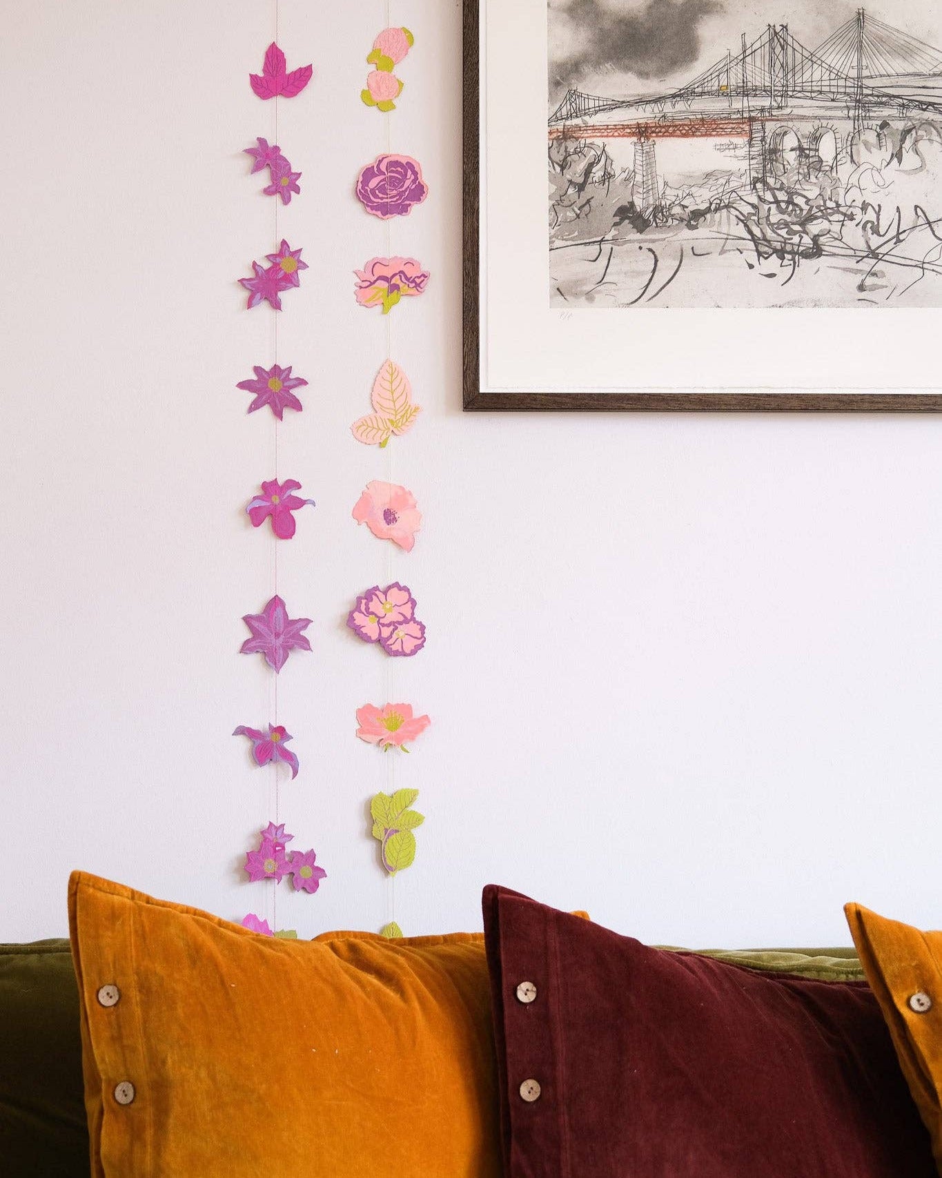 Med sine to meter i højden og over tyve håndtrykte blomster forvandler den ethvert rum med et strejf af poesi og livsglæde. Modsat klassiske guirlander er denne designet til at hænge lodret – perfekt til døråbninger, vægge eller hjørner, der trænger til lidt ekstra magi.