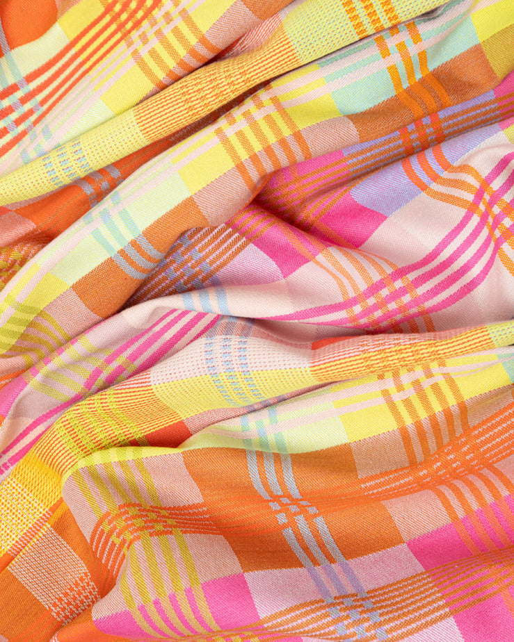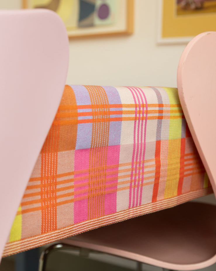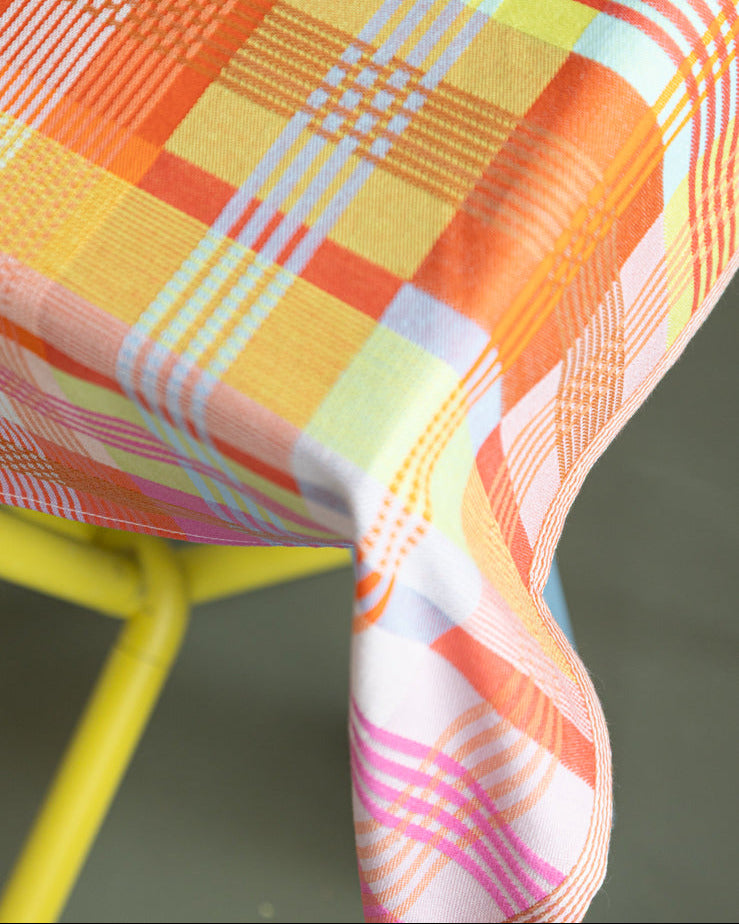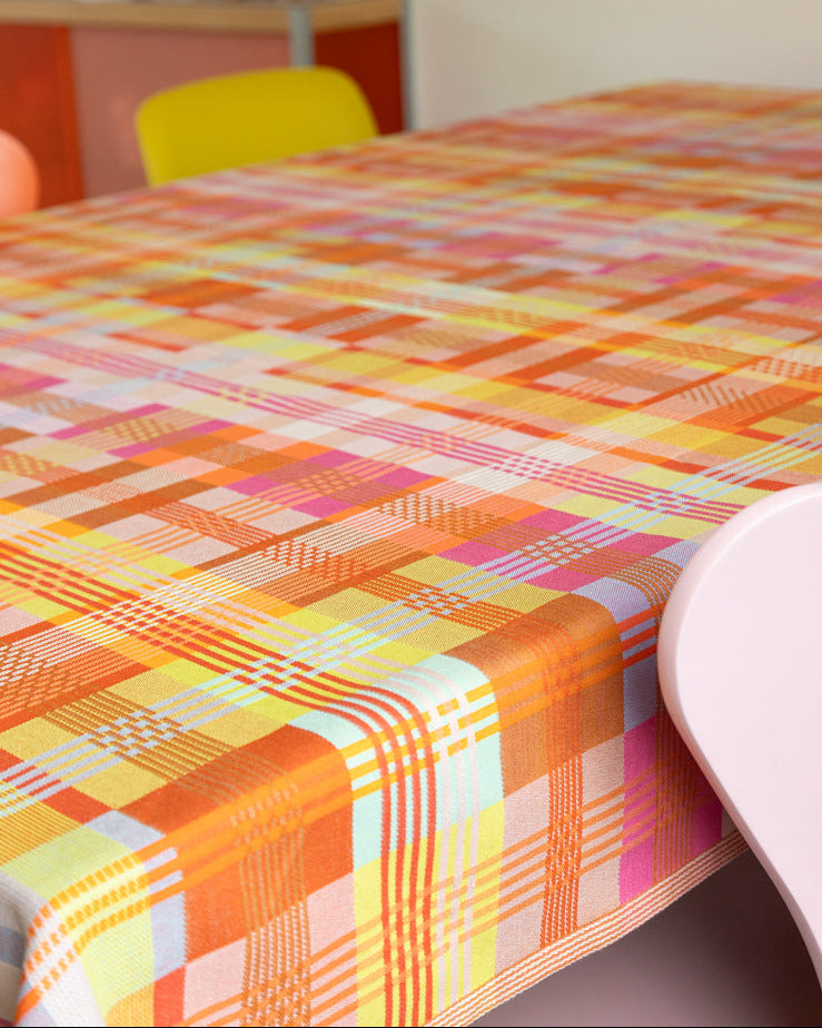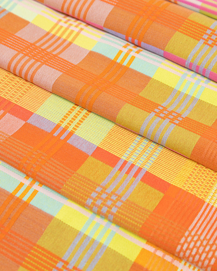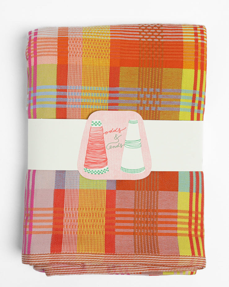 Denne smukke dug fra Odds & Ends-serien er vævet af tekstilrester i den skønneste farvekombination af gul-orange toner.
