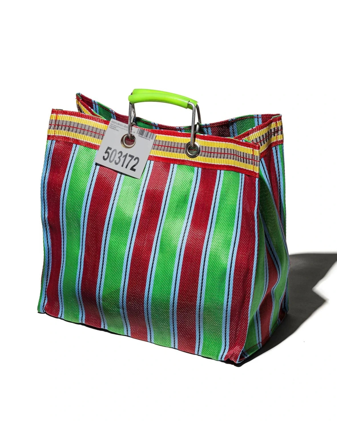 Den her rummelige indkøbstaske fra Puebco er lavet af genanvendt plast og syet med brede, farvede striber, der varierer fra taske til taske. Den er let, slidstærk og nem at folde sammen, når du ikke bruger den.