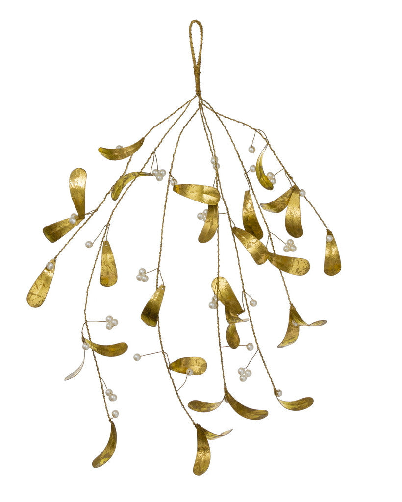Denne mistelten er håndlavet i børstet metal og dekoreret med metallic leaf og små perledetaljer, der fanger lyset og giver et diskret gyldent glimt. De syv grene folder sig ud som et lille kunstværk – luftig, elegant og lige præcis dramatisk nok til at gøre dørkarmen til decemberens mest interessante sted.