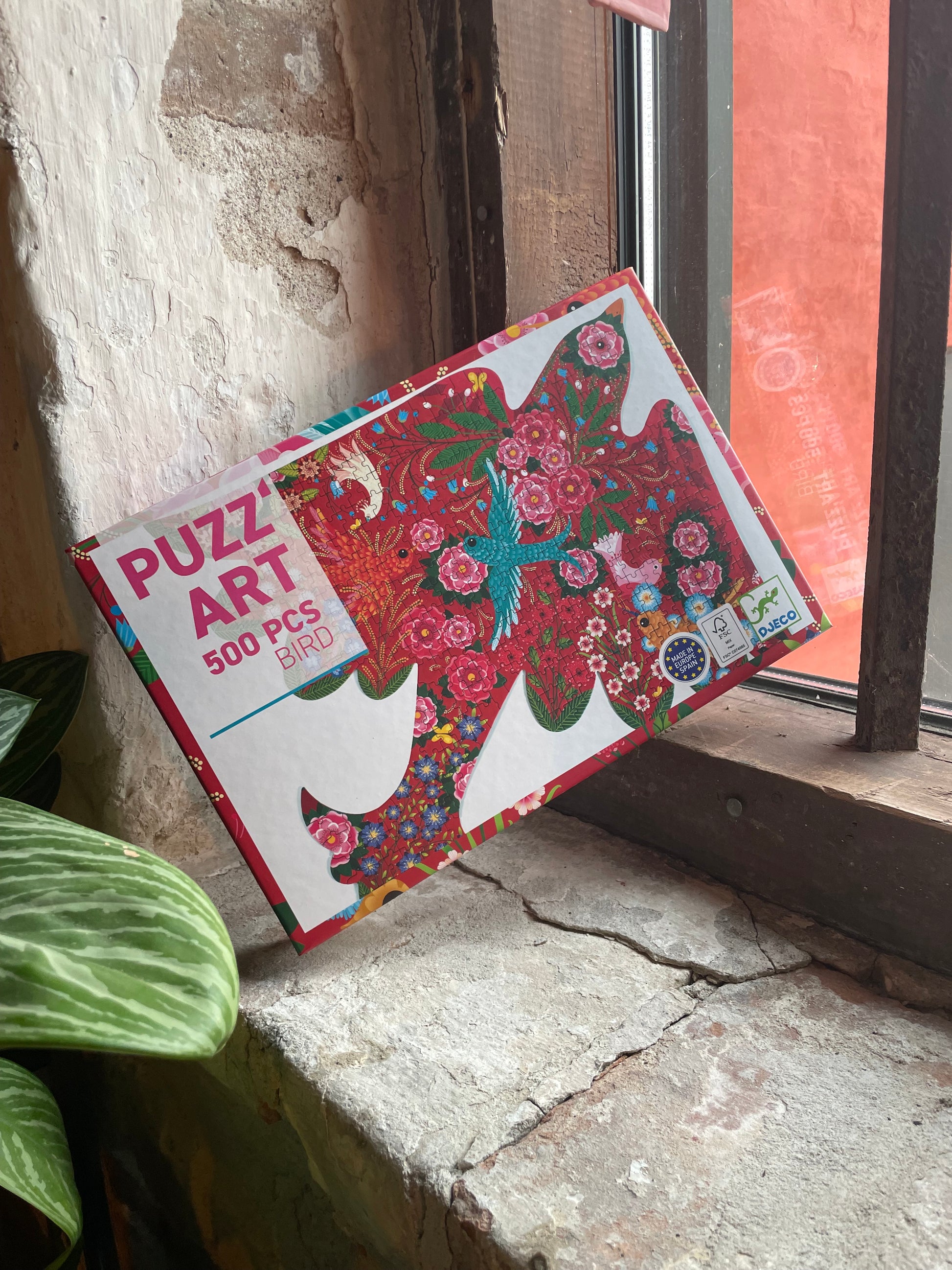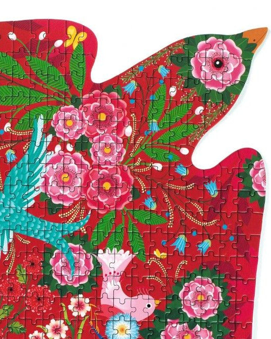 Puslespillet er udskåret som en flyvende fugl, men kig nærmere – motivet gemmer på et helt univers af små fugle, blomster og finurlige detaljer, der dukker op, efterhånden som brikkerne falder på plads.
