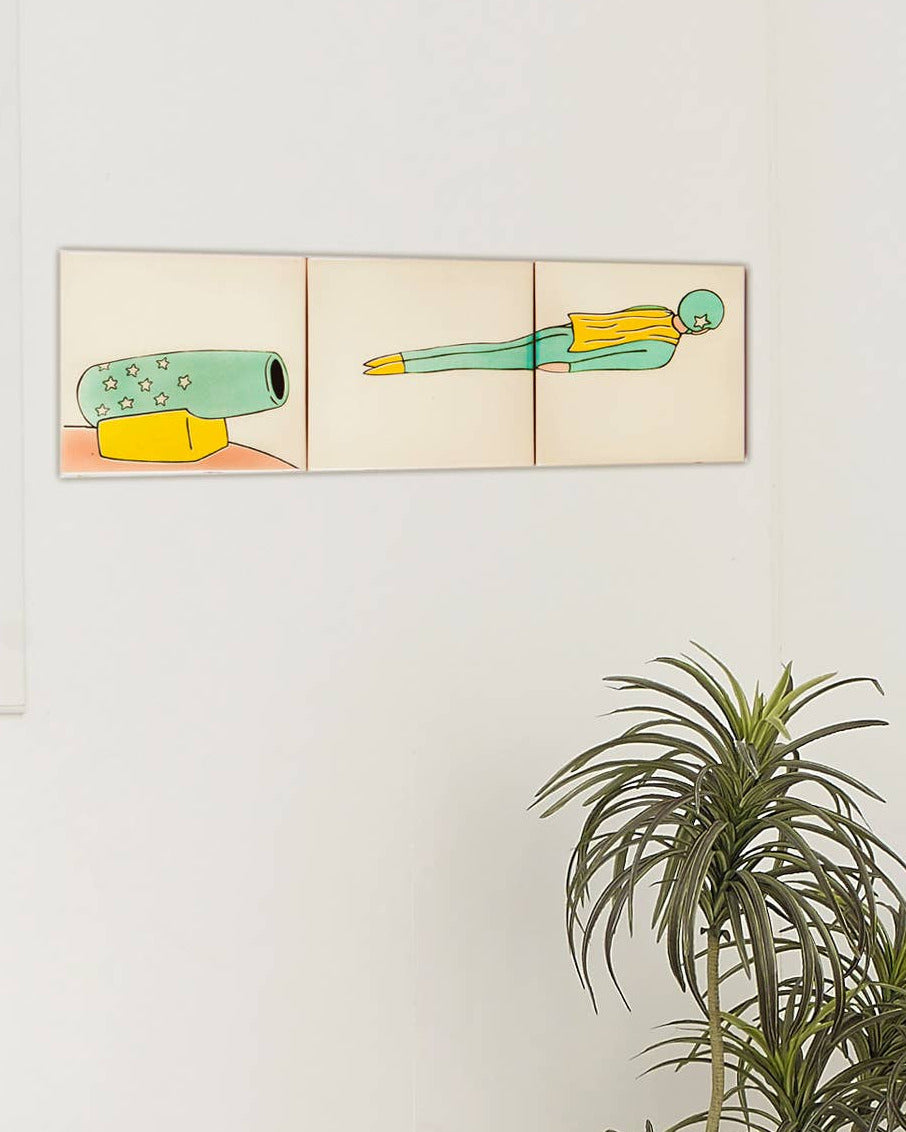 Den består af tre keramiske fliser med selvklæbende bagside, så du nemt og hurtigt kan sætte din personlige kunstinstallation direkte på væggen – uden brug af lim eller mørtel.